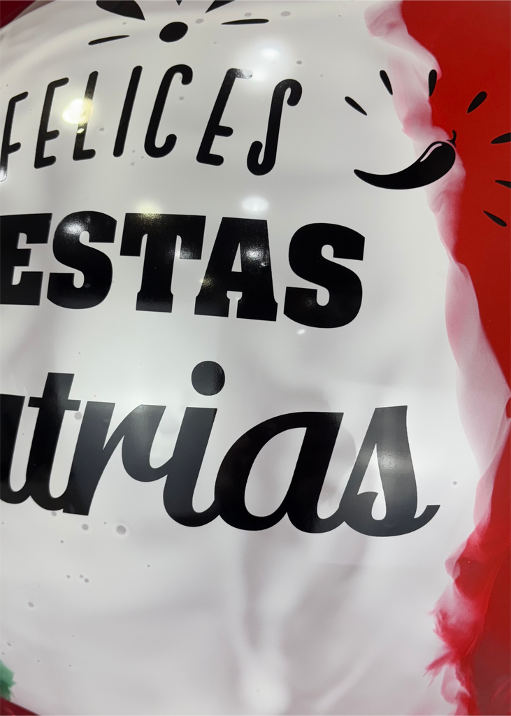 Globo burbuja de 24 pulgadas inflado con helio, decorado con pintura en franjas en colores verde, blanco y rojo, acompañado de guirnaldas de papel crepé en color blanco. También incluye 2 Orbz de 18” tricolor, decorados con papel crepé en tonos verde y rojo, un contrapeso y texto en vinil de colores.