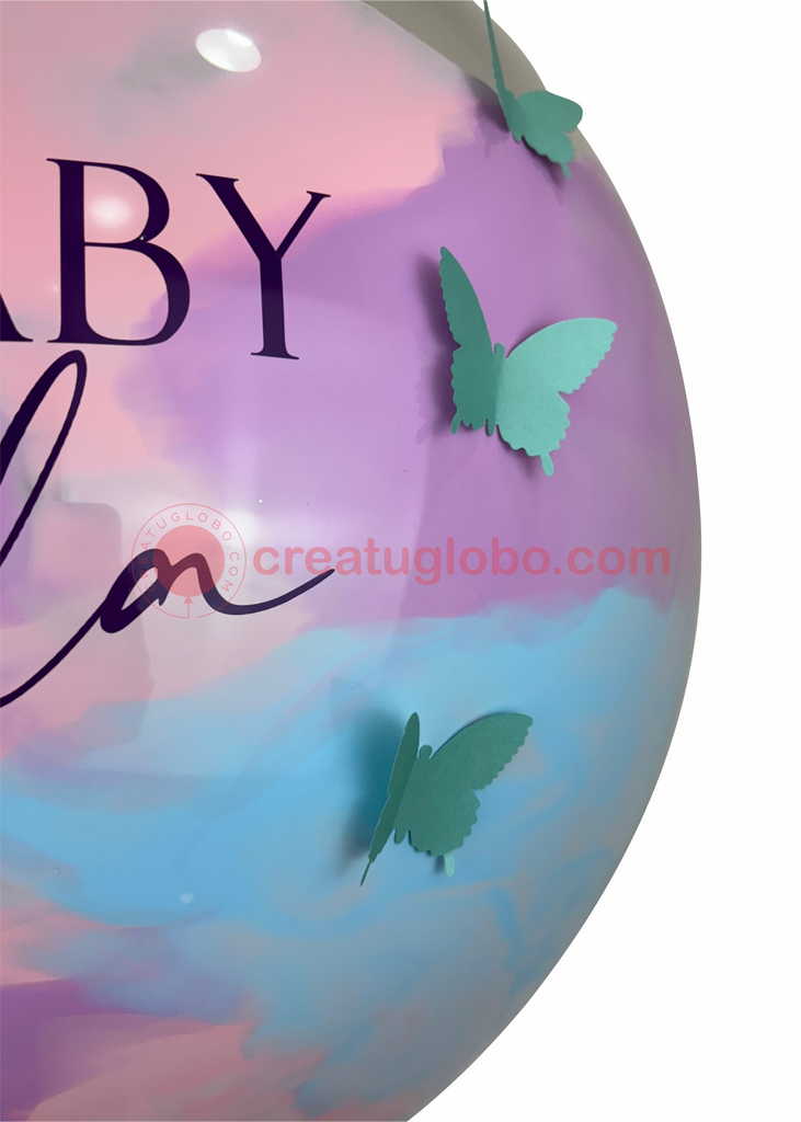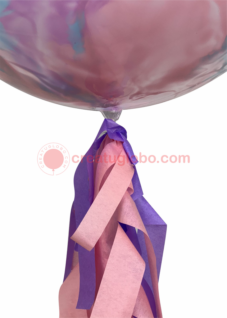 Globo burbuja de 24” con pintura lila , rosa y celeste , decorado con dos guirnaldas en color rosa y lila y un contrapeso