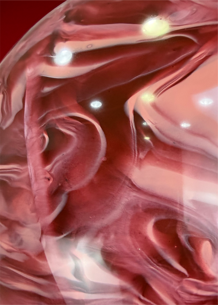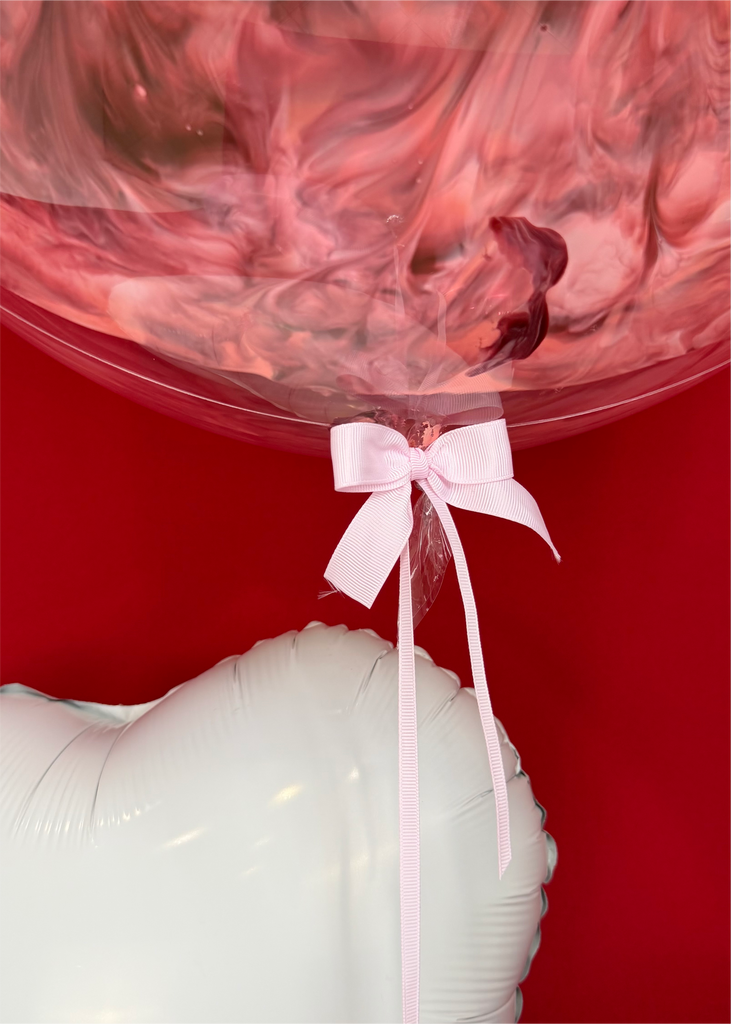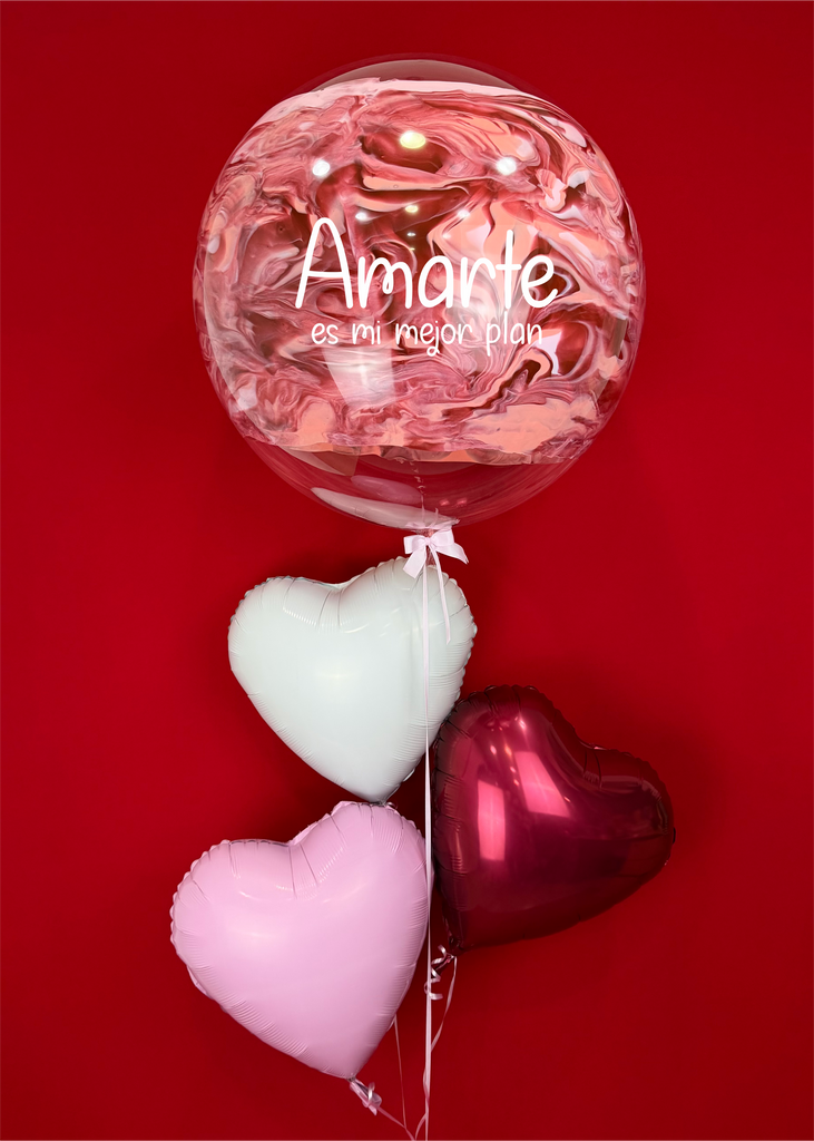 Arreglo con burbuja elaborada con técnica mármol, pintada en tonos rosa pastel, vino y coral, decorada con listón y moño. Incluye tres globos corazón en tonos vino y rosa pastel, creando un diseño elegante y llamativo.