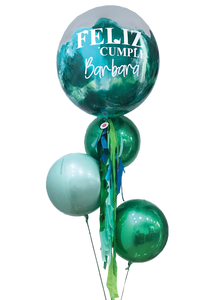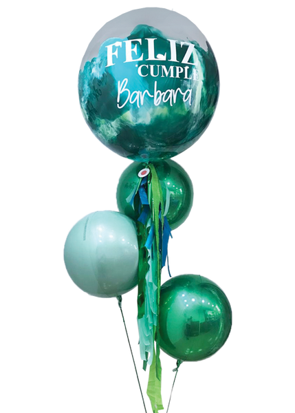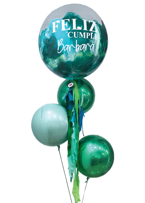 Una burbuja transparente de 3 pies con pintura color verde bandera, turquesa y menta, decorada con 2 guirnaldas completas color turquesa, verde menta, 1 tira de papel crepe verde limón y 1 tira metálica verde bandera. 3 esferas metálicas de 18 pulgadas, 2 verde bandera y 1 verde menta y un contrapeso. Altura promedio del globo: 1.60M. INCLUYE TEXTO CON VINIL.