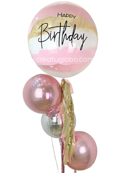 Un globo burbuja de 3 pies transparente decorado con pintura horizontal en color dorado, rosa bebe y blanco, decorado con dos guirnaldas completas rosa bebe, dorada, una cortina metálica rose gold y 3 esferas de 18 pulgadas (2 rosa, 1 plata) y un contrapeso. Altura promedio del globo: 1.60M. INCLUYE TEXTO CON VINIL.